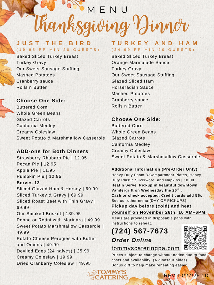 Thanksgiving Catering Services in Vandergrift. Explore our Thanksgiving menu by downloading the document below. To place your order, kindly complete the provided form. For 2025, we are offering two primary meal selections: "Just The Bird" and a combination of Turkey and Ham, accompanied by a variety of beloved side dishes that families cherish. Thank you for choosing us to make your Thanksgiving celebration special! There are 2 Menu's, One for Day before, and one Day of.